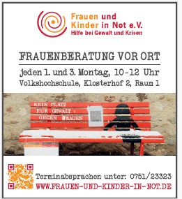 Zusätzliches Angebot für Hilfe bei Gewalt und Krisen: Am ersten und dritten Montag im Monat findet ganzjährig von 10:00 bis 12:00 Uhr eine Frauenberatung durch den Verein Frauen und Kinder in Not e.V. in der Volkshochschule im Klosterhof in Bad Waldsee statt. Terminabsprachen sind möglich unter 0751 23323.